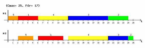 Uszeregowanie dla 2 maszyn i 5 zleceńWidzimy, że na pierwszej maszynie zadanie 1 zlecenia numer 2 ma czas równy zero i dlatego bloczek nie został wyrysowany, co jest sytuacją logiczną. Kolejność wykonywania zleceń jest w tym przypadku następująca: 2|4|3|1|5|. Długość uszeregowania Cmax = 23.